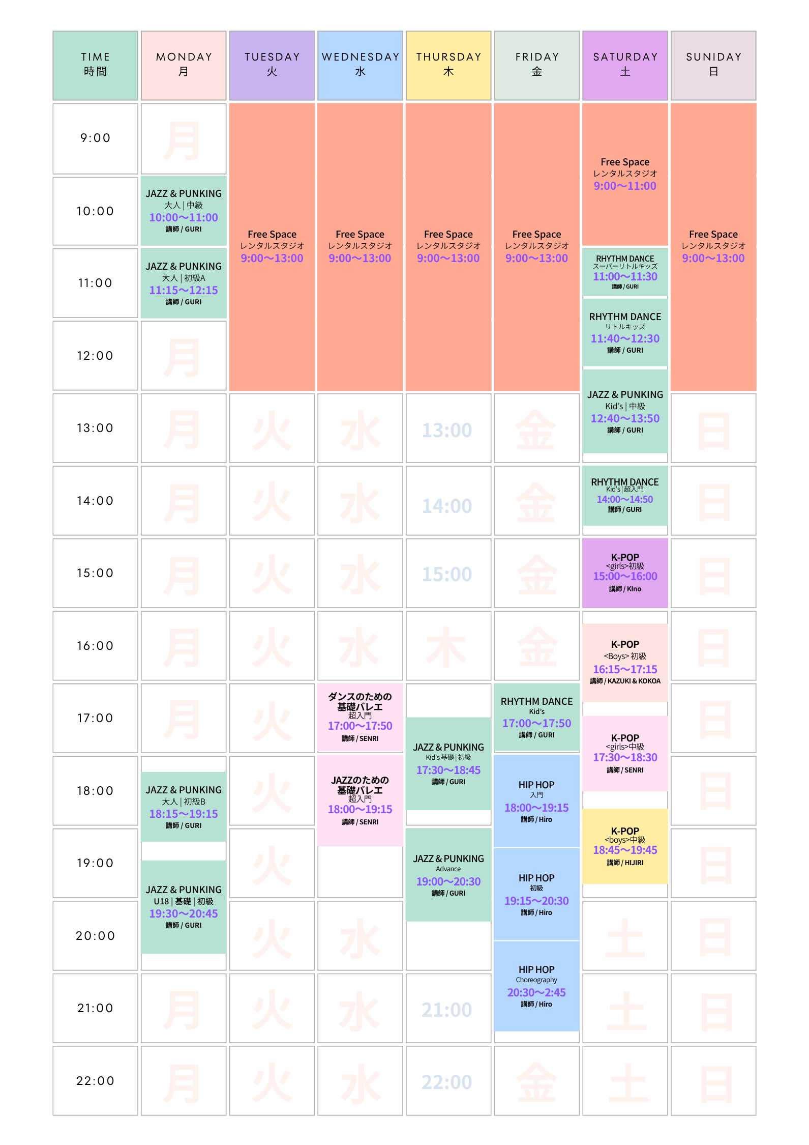 ダンスには色々なジャンルというのがありますが、ここではその前の段階でダンスを踊る時のカウントの数え方(振り付けを覚えたり教えたりする時に使う共通のタイミング)やアップダウン(アップビート、ダウンビート)の動き方捉え方やアイソレーション(身体の部分部分を動かす)など踊るのに必要なベースを学びリズムに合わせて動いていきます。